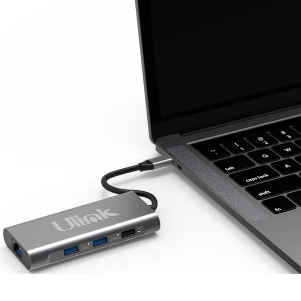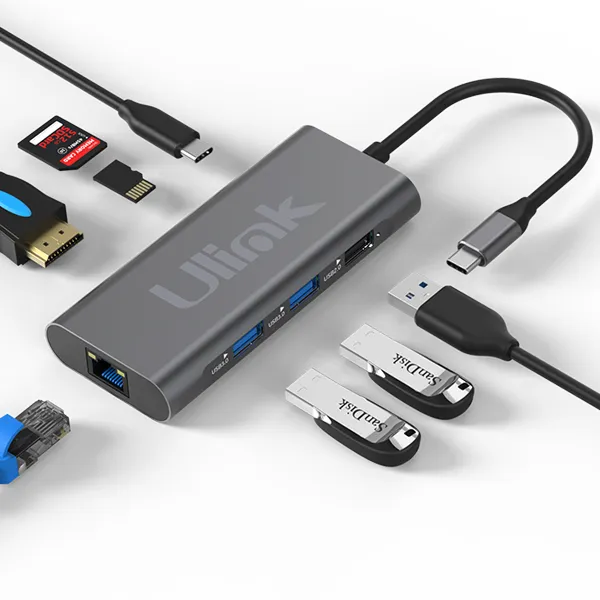 Adaptador multipuerto USB C 8 en 1 HDMI x1 USB2.0 x1 USB3.0 x2 PD x1 SD x1 TF x1 LAN10/100 x1 aluminio / UL-ADC801 - 0060147